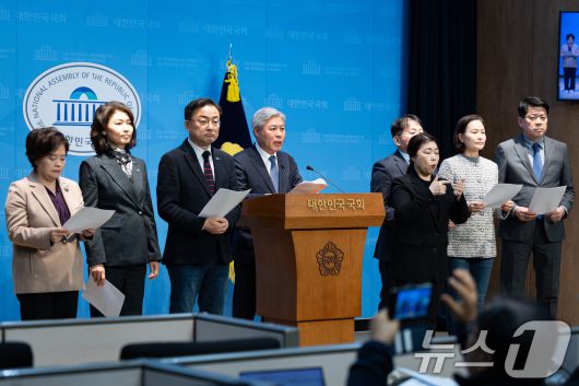 (서울=뉴스1) 유승관 기자 = 서왕진 조국혁신당 원내대표를 비롯한 의원들이 5일 서울 여의도 국회 소통관에서 내란전담재판부 설치법안 관련 기자회견을 하고 있다. 2025.12.5/뉴스1