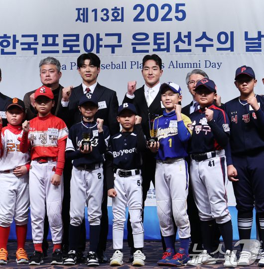 (서울=뉴스1) 오대일 기자 = 5일 서울 강남구 리베라호텔에서 열린 한국프로야구 은퇴선수협회 2025 '최고의 선수상' 시상식에서 '최고의 선수상'을 수상한 송성문(키움 히어로즈)과 '최고의 신인상'을 수상한 안현민(KT 위즈) 야구 꿈나무들과 포즈를 취하고 있다. 2025.12.5/뉴스1
