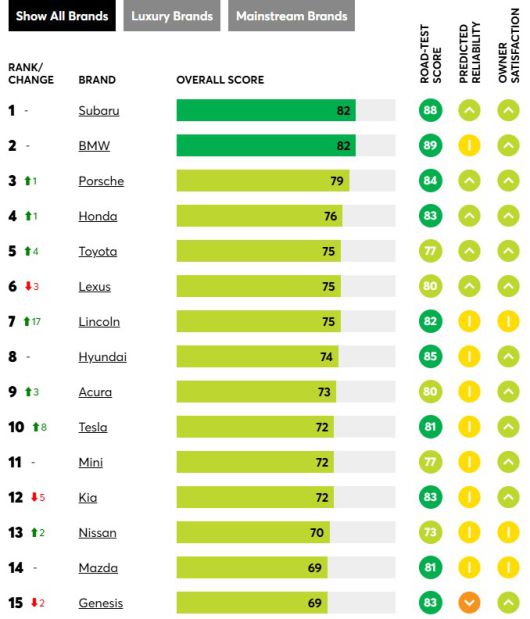 컨슈머리포트의 자동차 브랜드 평가는 자체 도로 주행 테스트와 안전성 평가, 브랜드 신뢰성과 소유자 만족도 설문조사 결과를 종합한 점수로 매겨진다.