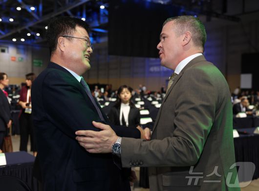 (서울=뉴스1) = 김대현 문화체육관광부 제2차관이 5일 부산 해운대구 벡스코에서 열린 세계도핑방지기구(WADA) 총회 폐회식에서 위톨드 반카 WADA 회장과 인사를 나누고 있다. (문화체육관광부 제공. 재판매 및 DB 금지) 2025.12.5/뉴스1urodoct2@news1.krCopyright ⓒ 뉴스1. All rights reserved. 무단 전재 및 재배포, AI학습 이용 금지.