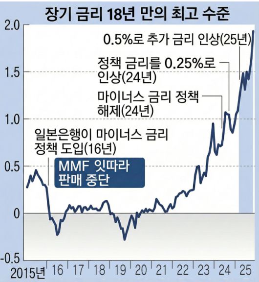 전환점은 지난해 3월 일본은행의 마이너스 금리 정책 해제였다. 일본은행은 이후 정책금리를 0.5%까지 끌어올렸고, 오는 12월 금융정책결정회의에서 추가 인상 가능성도 커지고 있다. 여기에 다카이치 사나에 내각의 확장 재정 정책과 국채 추가 발행 전망이 더해지며 10년물 국채 수익률은 최근 1.9% 대까지 치솟아 18년 만에 최고치를 기록했다.