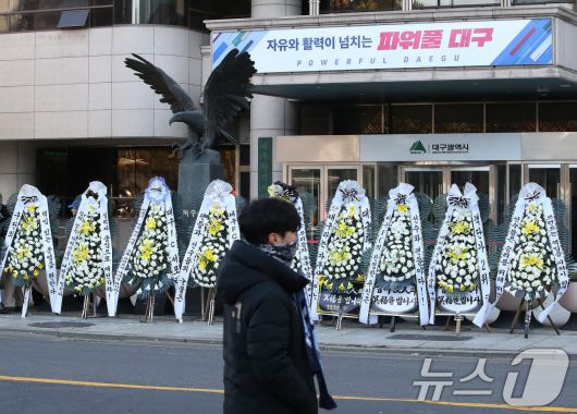 (대구=뉴스1) 공정식 기자 = 대구의 시민 프로축구단 대구FC 응원단(그라지예)과 축구팬들이 5일 오전 대구 중구 동인청사 앞에서 대구FC K리그2 강등에 대한 구단의 쇄신과 대책 마련 등을 요구하는 근조화환 시위를 벌이고 있다. 2025.12.5/뉴스1