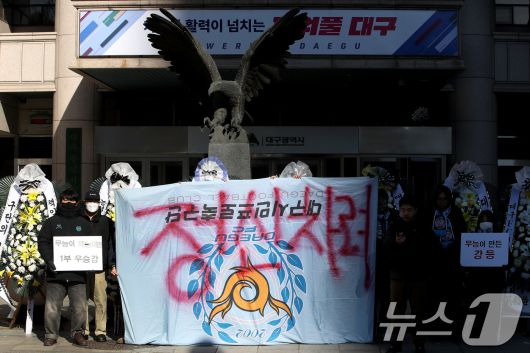 (대구=뉴스1) 공정식 기자 = 대구의 시민 프로축구단 대구FC 응원단(그라지예)과 축구팬들이 5일 오전 대구 중구 동인청사 앞에서 대구FC K리그2 강등에 대한 구단의 쇄신과 대책 마련 등을 요구하는 근조화환 시위를 벌이고 있다. 2025.12.5/뉴스1