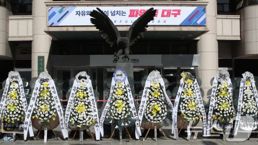 (대구=뉴스1) 공정식 기자 = 대구의 시민 프로축구단 대구FC 응원단(그라지예)과 축구팬들이 5일 오전 대구 중구 동인청사 앞에서 대구FC K리그2 강등에 대한 구단의 쇄신과 대책 마련 등을 요구하는 근조화환 시위를 벌이고 있다. 2025.12.5/뉴스1jsgong@news1.krCopyright ⓒ 뉴스1. All rights reserved. 무단 전재 및 재배포, AI학습 이용 금지.