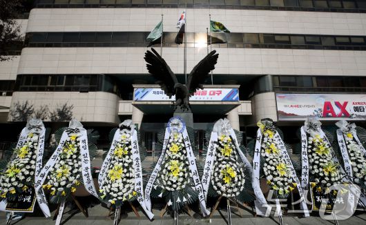 (대구=뉴스1) 공정식 기자 = 대구의 시민 프로축구단 대구FC 응원단(그라지예)과 축구팬들이 5일 오전 대구 중구 동인청사 앞에서 대구FC K리그2 강등에 대한 구단의 쇄신과 대책 마련 등을 요구하는 근조화환 시위를 벌이고 있다. 2025.12.5/뉴스1jsgong@news1.krCopyright ⓒ 뉴스1. All rights reserved. 무단 전재 및 재배포, AI학습 이용 금지.