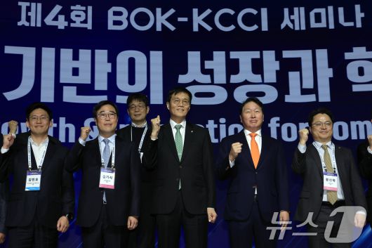 (서울=뉴스1) 박정호 기자 = 최태원 대한상공회의소 회장과 이창용 한국은행 총재가 5일 오후 서울시 중구 세종대로 대한상공회의소 국제회의장에서 'AI 기반의 성장과 혁신'을 주제로 열린 제4회 한국은행-대한상공회의소(BOK-KCCI) 공동세미나에서 주요 참석자들과 기념 촬영을 하고 있다. 2025.12.5/뉴스1