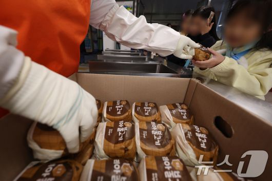 (대구=뉴스1) 공정식 기자 = 전국학교비정규직연대회의가 파업에 들어간 5일 대구의 한 초등학교 급식실에서 학생들이 대체식으로 제공된 햄버거를 받고 있다. 2025.12.5/뉴스1