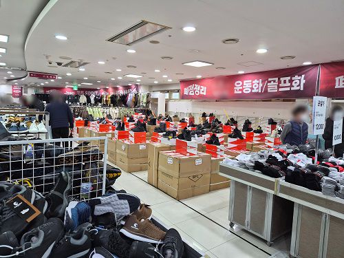 스포츠 브랜드 의류 물량 집중되어 가장 사람 많은 층 5층은 이번 고별전에서 가장 많은 사람들이 몰린 층이다. 스포츠 브랜드 맨투맨, 후드, 바지가 2만9천 원에 대거 진열돼 있었고, 사람들이 몰려 상품을 고르는 모습이 인상적이었다.
