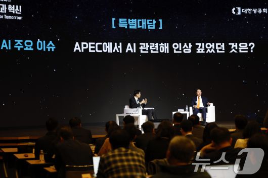 (서울=뉴스1) 박정호 기자 = 최태원 대한상공회의소 회장과 이창용 한국은행 총재가 5일 오후 서울시 중구 세종대로 대한상공회의소 국제회의장에서 'AI 기반의 성장과 혁신'을 주제로 열린 제4회 한국은행-대한상공회의소(BOK-KCCI) 공동세미나에서 특별대담을 하고 있다. 2025.12.5/뉴스1