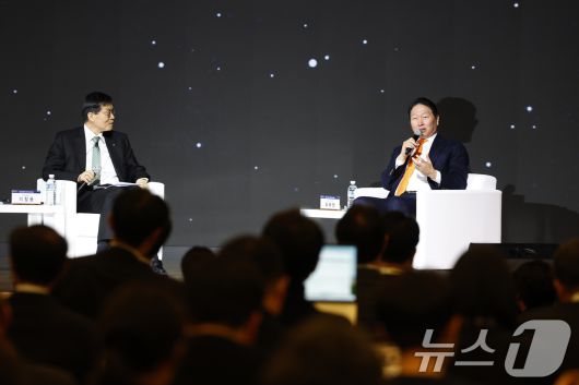 (서울=뉴스1) 박정호 기자 = 최태원 대한상공회의소 회장과 이창용 한국은행 총재가 5일 오후 서울시 중구 세종대로 대한상공회의소 국제회의장에서 'AI 기반의 성장과 혁신'을 주제로 열린 제4회 한국은행-대한상공회의소(BOK-KCCI) 공동세미나에서 특별대담을 하고 있다. 2025.12.5/뉴스1