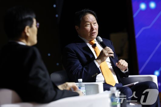 (서울=뉴스1) 박정호 기자 = 최태원 대한상공회의소 회장이 5일 오후 서울시 중구 세종대로 대한상공회의소 국제회의장에서 'AI 기반의 성장과 혁신'을 주제로 열린 제4회 한국은행-대한상공회의소(BOK-KCCI) 공동세미나에서 이창용 한국은행 총재와 특별대담을 하고 있다. 2025.12.5/뉴스1