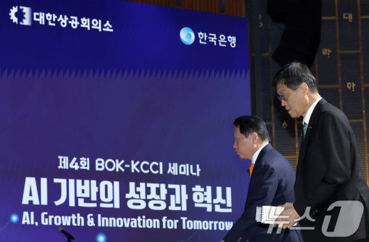 (서울=뉴스1) 박정호 기자 = 최태원 대한상공회의소 회장과 이창용 한국은행 총재가 5일 오후 서울시 중구 세종대로 대한상공회의소 국제회의장에서 'AI 기반의 성장과 혁신'을 주제로 열린 제4회 한국은행-대한상공회의소(BOK-KCCI) 공동세미나에서 특별대담을 위해 단상에 오르고 있다. 2025.12.5/뉴스1