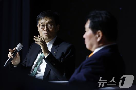 (서울=뉴스1) 박정호 기자 = 이창용 한국은행 총재가 5일 오후 서울시 중구 세종대로 대한상공회의소 국제회의장에서 'AI 기반의 성장과 혁신'을 주제로 열린 제4회 한국은행-대한상공회의소(BOK-KCCI) 공동세미나에서 최태원 대한상공회의소 회장과 특별대담을 갖고 있다. 2025.12.5/뉴스1