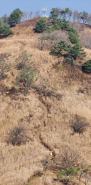 정상에 오르면 커다란 표지석이 우뚝 서있다. 누구랄 것도 없이 줄을 서고 그 앞에서 다시 한번 포즈를 취한다. 잠시 정상의 벤치 앉아 정복에 성공한 이들의 표정을 보니 산에 오르기 시작할 때처럼 찌푸린 이가 단 한 명도 없다. 민둥산의 정상은 사방으로 탁 트였다. 가까운 주변에 이보다 높은 산이 없어서인지 산 아래 풍경이 한눈에 들어온다. 산등성이 오롯한 길을 따라 한 걸음씩 걸음을 내딛는 이들의 모습도 그 안에 담겨 있다.