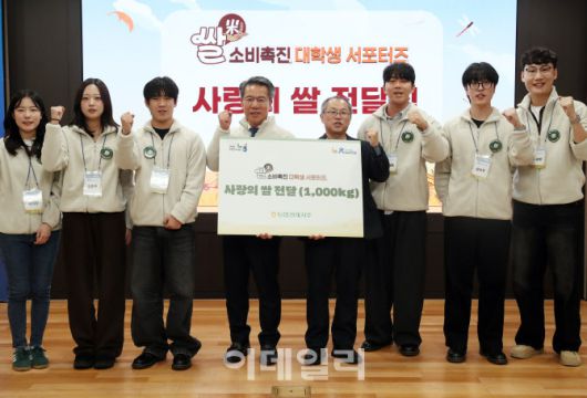 [이데일리 김태형 기자] 박서홍(왼쪽 네번째) 농협경제지주 농업경제대표이사가 5일 농협중앙회 본관에서 열린 ‘쌀 소비촉진 대학생 서포터즈’해단식에서 서포터즈 등과 사랑의 쌀을 전달하고 있다.