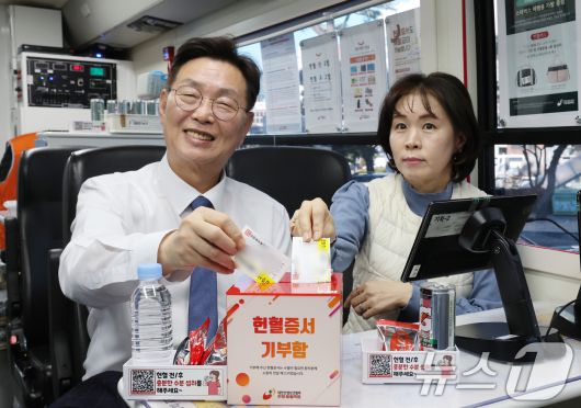 (대전=뉴스1) 김기태 기자 = 김제선 대전 중구청장과 직원이 5일 대전 중구청에서 동절기 혈액수급 안정화를 위해 단체헌혈을 마치고 헌혈증을 기부하고 있다. 중구는 최근 혈액 보유량이 감소함에 따라 지역사회의 적극적인 참여를 통해 안정적인 혈액공급을 지원하고, 생명나눔 문화 확산에 기여하기 위해 단체 헌혈을 마련했다. 2025.12.5/뉴스1