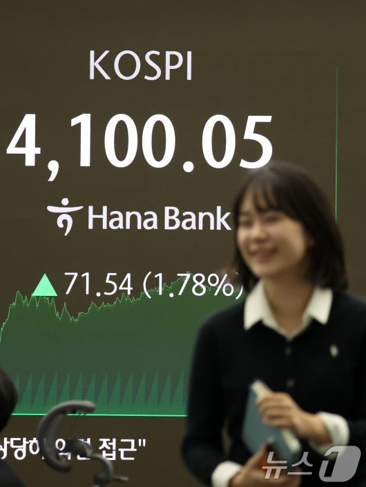 (서울=뉴스1) 김명섭 기자 = 5일 오후 서울 중구 하나은행 딜링룸 전광판에 시황과 원달러 환율이 보이고 있다. 이날 코스피 지수는 전 거래일 대비 71.54포인트(1.78%) 오른 4,100.05로, 코스닥 지수는 전 거래일 대비 5.09포인트(0.55%) 내린 924.74로 장을 마감했다. 2025.12.5/뉴스1