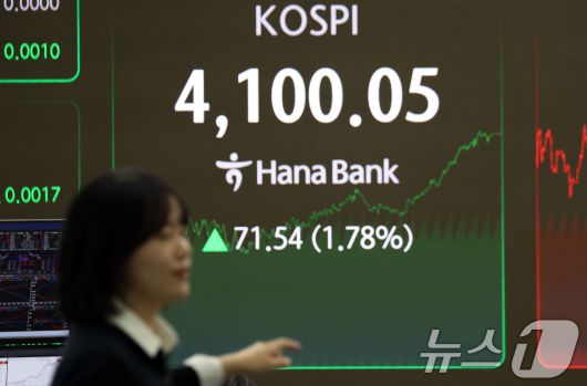 (서울=뉴스1) 김명섭 기자 = 5일 오후 서울 중구 하나은행 딜링룸 전광판에 시황과 원달러 환율이 보이고 있다. 이날 코스피 지수는 전 거래일 대비 71.54포인트(1.78%) 오른 4,100.05로, 코스닥 지수는 전 거래일 대비 5.09포인트(0.55%) 내린 924.74로 장을 마감했다. 2025.12.5/뉴스1