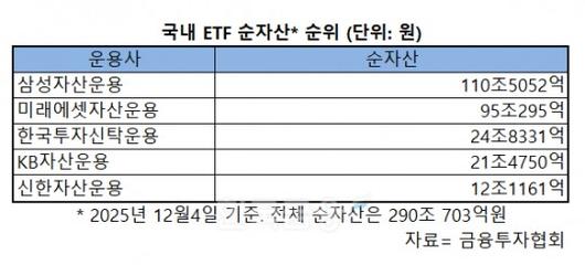 금융투자협회에 따르면, 현재 국내 ETF 시장 순자산은 290조원 규모이며, 신한운용의 SOL ETF 순자산은 12조원 규모로, 삼성, 미래에셋, 한투, KB에 이어 5위를 기록 중이다.
