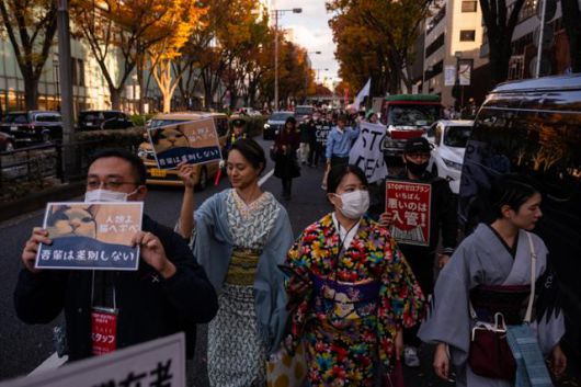 일본 시민단체 인사들이 지난달 16일 도쿄 도내에서 열린 반이민 정책 반대 시위에 참석해 일본 정부의 외국인 규제 정책을 규탄하고 있다. 도쿄=AP 연합뉴스 |