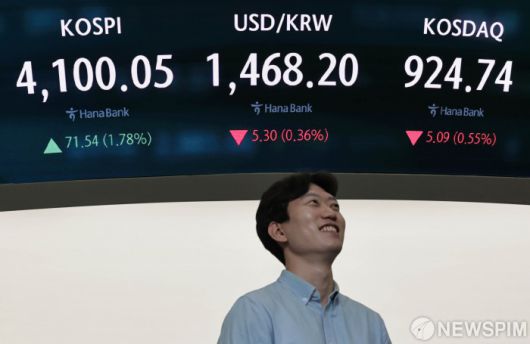 [서울=뉴스핌] 양윤모 기자 = 5일 오후 코스피가 전장 종가보다 71.54 포인트(1.78%) 상승하며 4100.05로, 코스닥은 5.09 포인트(0.55%) 하락한 924.74로 장을 마감한 가운데, 서울 중구 하나은행 딜링룸에서 직원들이 업무를 보고 있다. 서울외환시장에서 달러/원 환율은 전장 대비 5.30원 하락한 1468.20원에 주간거래를 마감했다. 2025.12.05 yym58@newspim.com