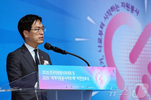 (서울=뉴스1) = 김민재 행정안전부 차관이 5일 오후 경기 고양 킨텍스에서 열린 2025 전국자원봉사자대회 및 2026년 '세계자원봉사자의 해' 비전 선포식에서 대통령 축사를 대독하고 있다. (행정안전부 제공. 재판매 및 DB 금지) 2025.12.5/뉴스1