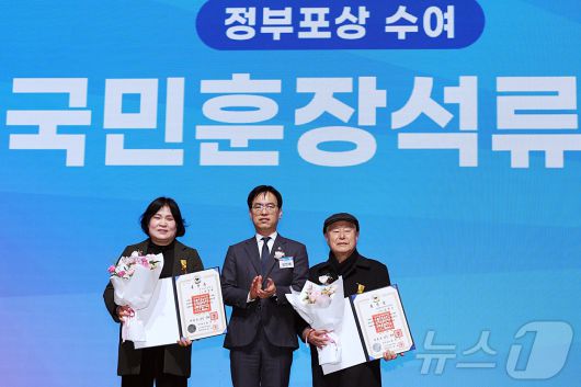 (서울=뉴스1) = 김민재 행정안전부 차관이 5일 오후 경기 고양 킨텍스에서 열린 2025 전국자원봉사자대회 및 2026년 '세계자원봉사자의 해' 비전 선포식에서 자원봉사 유공자 임형순 씨와 이경채 씨에게 국민훈장 석류장을 수여하고 기념 촬영을 하고 있다. (행정안전부 제공. 재판매 및 DB 금지) 2025.12.5/뉴스1