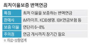 iM라이프가 내놓은 '스타트프로변액연금보험'은 펀드 운용 성과에 상관없이 최대 40년간 연단리 7%로 부리가 되는 연금액을 보증한다. 40년 후에는 연 5%를 보증한다. 물론 연단리 7%는 연복리 기준 3.82%로 떨어지지만 연 3%대 이율의 예금을 찾기 어려운 현시점을 고려하면 높은 수준으로 평가할 만하다. 변액연금보험이라는 특성상 운용 성과에 따라 연 7% 이상의 수익률을 기록할 수도 있다.