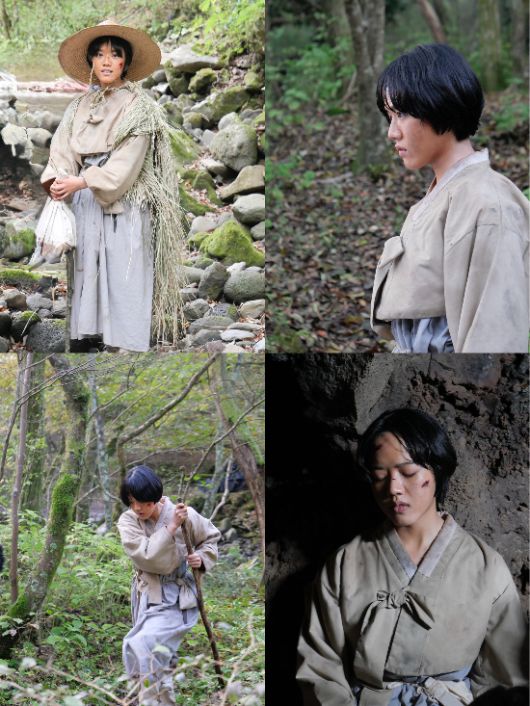 스틸 속 김향기는 전통 의상을 착용한 채 험준한 산길을 헤치고 나아가며 얼굴과 손에 난 상처, 흐트러진 머리칼까지 극 중 인물 ‘아진’이 맞닥뜨린 고난의 순간을 생생하게 드러낸다. 또한 동굴에서 눈을 감고 휴식을 취하는 장면은 극한의 감정을 축적하며 몰입하는 그의 집중력을 보여주고, 풀을 엮어 만든 우비를 걸치고 환하게 웃는 모습은 촬영장의 분위기를 밝히는 그의 에너지를 짐작게 한다.