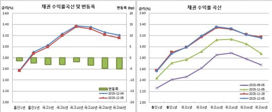 5일 채권시장과 금융투자협회에 따르면 통안2년물은 2.3bp 하락한 2.878%를 기록했다. 국고3년물은 3.1bp 내린 2.994%를 보였다. 이는 지난달 28일(2.991%) 이후 처음으로 3%를 밑돈 것이다. 국고10년물은 1.8bp 떨어진 3.358%를, 국고30년물은 4.7bp 하락한 3.211%를 나타냈다.