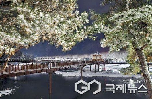 소나무 가지마다 쌓인 눈이 꽃처럼 피어난 가운데 사진 속 에코브릿지는 하천과 정자를 잇는 선을 은빛으로 그리며 설경의 중심에 섰다.