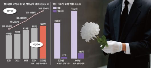 공정위는 웅진에 대한 통제를 넘어 상조 업계 전반을 겨냥한 재무 압박 수위도 높이고 있다. 올해 3월 말 기준 국내 상조 가입자 수는 960만 명, 선수금 규모는 10조 3348억 원에 달한다. 4년 전보다 가입자는 40%, 선수금은 4조 원 가까이 급증하며 시장이 비대해지자 소비자 보호를 위한 고삐를 죄기 시작한 것이다. 이에 공정위는 양대 상조공제조합 이사장과 주요 회원사 대표들을 소집해 담보금 비율 인상을 강력히 주문했다. 이에 따라 상조보증공제조합은 2029년까지 담보 비율을 현재 대비 24.3% 인상하고 공제료율은 무려 110% 올리기로 했다. 한국상조공제조합 역시 같은 기간 담보 비율을 7.3%, 공제료율은 35.3% 인상한다.