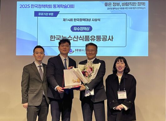 [소재봉 기자] [포인트경제] 한국농수산식품유통공사(aT)가 5일 한국정책학회가 주최한 '제14회 한국정책대상'에서 우수 정책상을 수상했다.