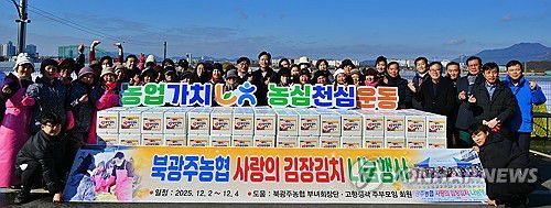 (광주=연합뉴스) 북광주농협은 2∼4일 김치 1천200포기를 담가 취약계층에 지원했다고 5일 밝혔다. 봉사에 참여한 임직원, 주부모임 회원들이 지난 4일 본점에서 김장을 마치고 기념사진을 찍고 있다. 2025.12.5 [농협 광주본부 제공. 재판매 및 DB 금지]