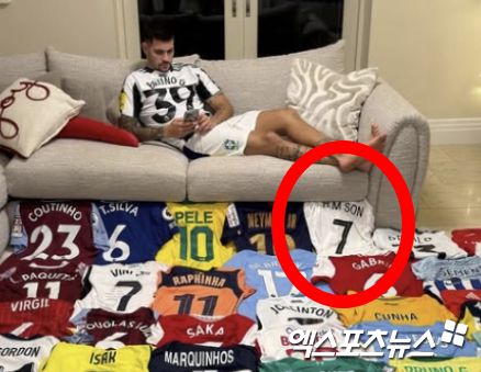 (엑스포츠뉴스 김환 기자) 브라질 국가대표 미드필더 브루누 기마랑이스가 공개한 유니폼 컬렉션에 손흥민의 유니폼이 눈에 띈다.