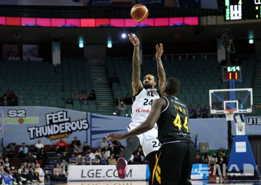[서울=뉴시스] 이영환 기자 = 5일 오후 서울 송파구 잠실실내체육관에서 열린 2025-2026 KBL 서울 삼성과 수원 KT의 경기, KT 데릭 윌리엄스가 슛을 하고 있다. 2025.12.05. 20hwan@newsis.com