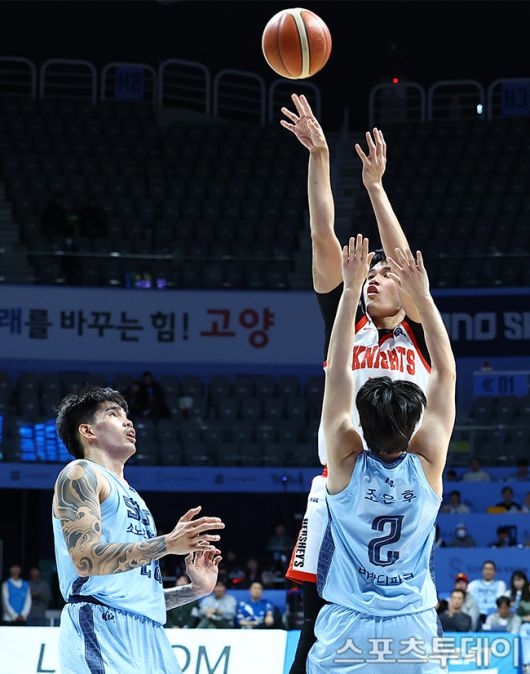 [스포츠투데이 팽현준 기자] 5일 경기도 고양소노아레나에서 열린 2025-2026 프로농구 고양 소노와 서울 SK의 경기, 소노 조은후가 파울을 하고 있다. 2025.12.05. [스포츠투데이 팽현준 기자 sports@stoo.com]