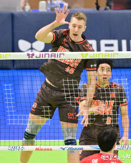 (엑스포츠뉴스 수원, 김한준 기자) 5일 오후 경기도 수원실내체육관에서 열린 '진에어 2025-2026 V-리그' 한국전력과 OK저축은행의 경기, OK저축은행 오데이가 공격을 시도하고 있다.김한준 기자 kowel@xportsnews.com