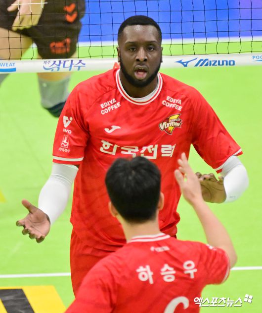 (엑스포츠뉴스 수원, 김한준 기자) 5일 오후 경기도 수원실내체육관에서 열린 '진에어 2025-2026 V-리그' 한국전력과 OK저축은행의 경기, 한국전력 베논이 득점 후 기뻐하고 있다.