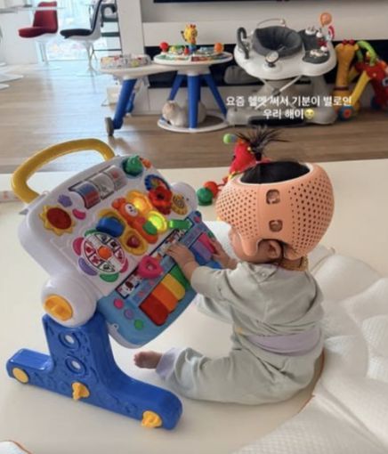 해이가 착용한 헬멧은 영유아의 비대칭 두상을 교정하기 위해 사용되는 전문 의료기구다. 아기 두개골은 생후 초기 아직 단단하게 굳지 않은 상태이기 때문에 특정 방향으로 눌리면 모양이 변형될 수 있다. 자연적으로 교정되기도 하지만, 비대칭이 뚜렷하거나 지속될 경우 얼굴 형태에도 영향을 줄 수 있어 일정 기간 헬멧 착용 치료를 진행하기도 한다. 해이 역시 보다 균형 잡힌 두상으로 성장할 수 있도록 교정 치료를 받고 있는 것으로 보인다.