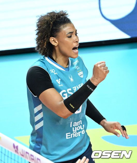 [OSEN=장충, 이대선 기자] 5일 오후 서울 장충체육관에서 프로배구 진에어 2025~26 V리그 GS칼텍스와 페퍼저축은행의 경기가 열렸다. 페퍼저축은행은 6승 5패 승점 17점으로 리그 4위, GS칼텍스는 5승 6패 승점 16점으로 5위에 올라 있다. 2세트 GS칼텍스 실바가 득점에 환호하고 있다. 2025.12.05 /sunday@osen.co.kr