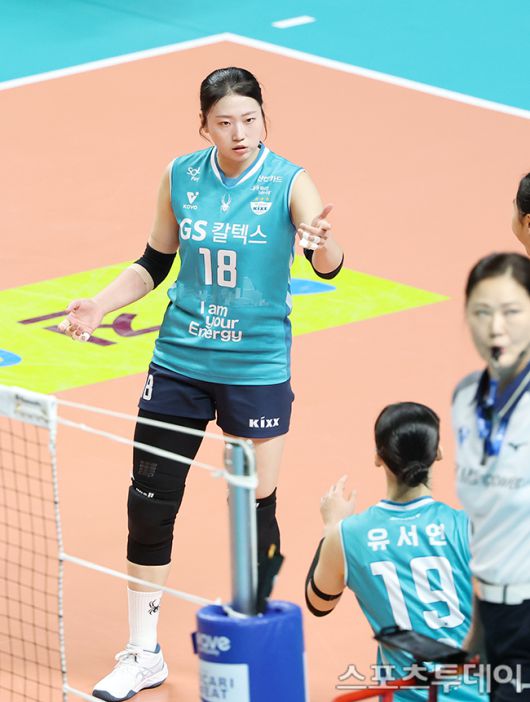 [스포츠투데이 권광일 기자] 2025-2026 진에어 V-리그 여자부 GS칼텍스-페퍼저축은행 경기가 5일 서울 장충체육관에서 열렸다. GS칼텍스 권민지가 유서연의 득점 성공에 감탄하고 있다. 2025.12.05. [스포츠투데이 권광일 기자 sports@stoo.com]