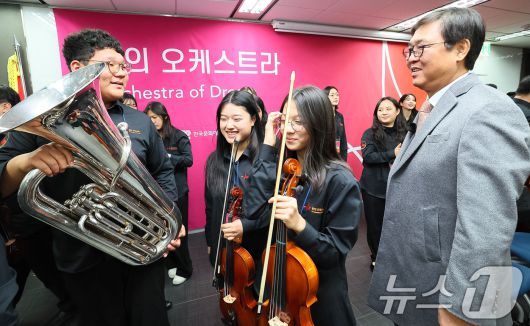 (서울=뉴스1) 김명섭 기자 = 최휘영 문화체육관광부 장관이 5일 서울 마포구 YTN홀에서 열린 ‘꿈의 예술단 15주년 기념행사’ 시작에 앞서 대기실을 찾아 단원들을 격려하고 있다. (문화체육관광부 제공. 재판매 및 DB 금지) 2025.12.5/뉴스1msiron@news1.krCopyright ⓒ 뉴스1. All rights reserved. 무단 전재 및 재배포, AI학습 이용 금지.
