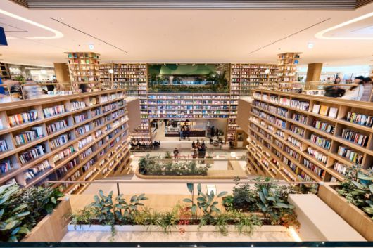 복층 서가 사이로는 '북스테어'라 불리는 계단형 라운지가 이어지고, 서가 옆에 있는 카페에서는 사람들이 책과 브런치를 즐길 수 있습니다.