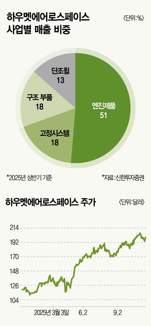 하우멧에어로스페이스는 항공기 부품을 생산하는 회사다. 지난 2020년 미국 알루미늄 기업 알코아에서 분사해 뉴욕증권거래소(NYSE)에 상장했다. 블레이드·링·에어포일 등 항공기와 군용기 엔진에 필요한 부품과 볼트·너트·인서트·리벳·래치·피팅 등 고정 장치를 주로 제조한다. 항공기 날개와 착륙 장치 등에 사용되는 구조 부품과 대형 트럭이나 버스용 단조 알루미늄 휠도 만든다.