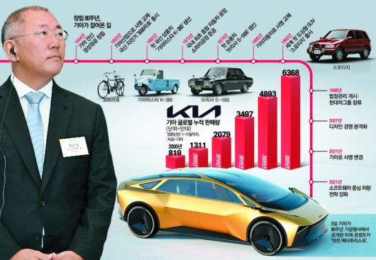 시제품 자전거 12대로 시작해 연 매출 100조원 글로벌 기업으로 성장한 기아가 5일 창립 80주년을 맞았다. 이날 기아는 위기가 심할 수록 더 강해지는 특유 DNA를 살려 글로벌 미래차 판도를 주도하겠다는 ‘100년 대계’ 포부를 밝혔다.