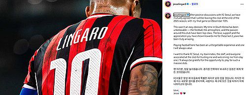 이어 "K리그와 구단의 역사를 새롭게 써 내려가며 한결같은 모습으로 팀을 위해 모든 것을 함께 해준 린가드에게 무한한 존경과 감사의 마음을 전한다"며 "긴 시간 고심했을 선수의 결정과 새로운 도전에도 아낌없는 응원을 보낼 예정"이라고 덧붙였다. 작별 인사를 남긴 제시 린가드. 2025.12.5 [제시 린가드 SNS 캡처. 재판매 및 DB 금지]