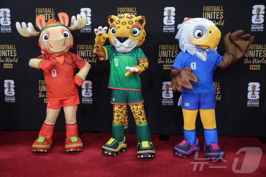 (AFP=뉴스1) = 5일(현지시간) 미국 워싱턴DC 케네디센터에서 열린 2026 북중미 월드컵 조 추첨식에 앞서 공식 마스코트인 캐나다의 무스. 멕시코의 재규어, 미국의 독수리가 레드카펫에서 포즈를 취하고 있다. 한국은 개최국 멕시코, 남아프리카공화국, 유럽 플레이오프 D조(덴마크, 북마케도니아, 체코, 아일랜드 승자)와 함께 A조에서 32강 진출을 두고 격돌한다. ⓒ AFP=뉴스1