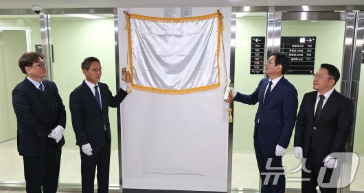 (서울=뉴스1) 장수영 기자 = '관봉권 띠지 폐기 의혹'과 '쿠팡 퇴직금 불기소 외압 의혹'을 수사하는 안권섭 특별검사(왼쪽 두번째)가 6일 서울 서초구에 마련된 특검 사무실에서 김호경 수사단장(왼쪽), 김기욱 특검보(왼쪽 세번째), 권도형 특검보와 함께 현판식을 하고 있다. 2025.12.6/뉴스1