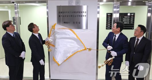 (서울=뉴스1) 장수영 기자 = '관봉권 띠지 폐기 의혹'과 '쿠팡 퇴직금 불기소 외압 의혹'을 수사하는 안권섭 특별검사(왼쪽 두번째)가 6일 서울 서초구에 마련된 특검 사무실에서 김호경 수사단장(왼쪽), 김기욱 특검보(왼쪽 세번째), 권도형 특검보와 함께 현판식을 하고 있다. 2025.12.6/뉴스1